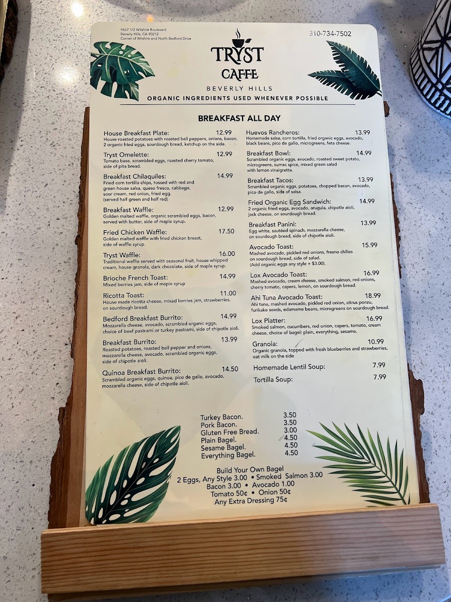 Jack cheese, avocado, 2 eggs, arugula, garlic aiolo on sourdough. Side salad. Option: Add bacon (choice of turkey bacon or pork)